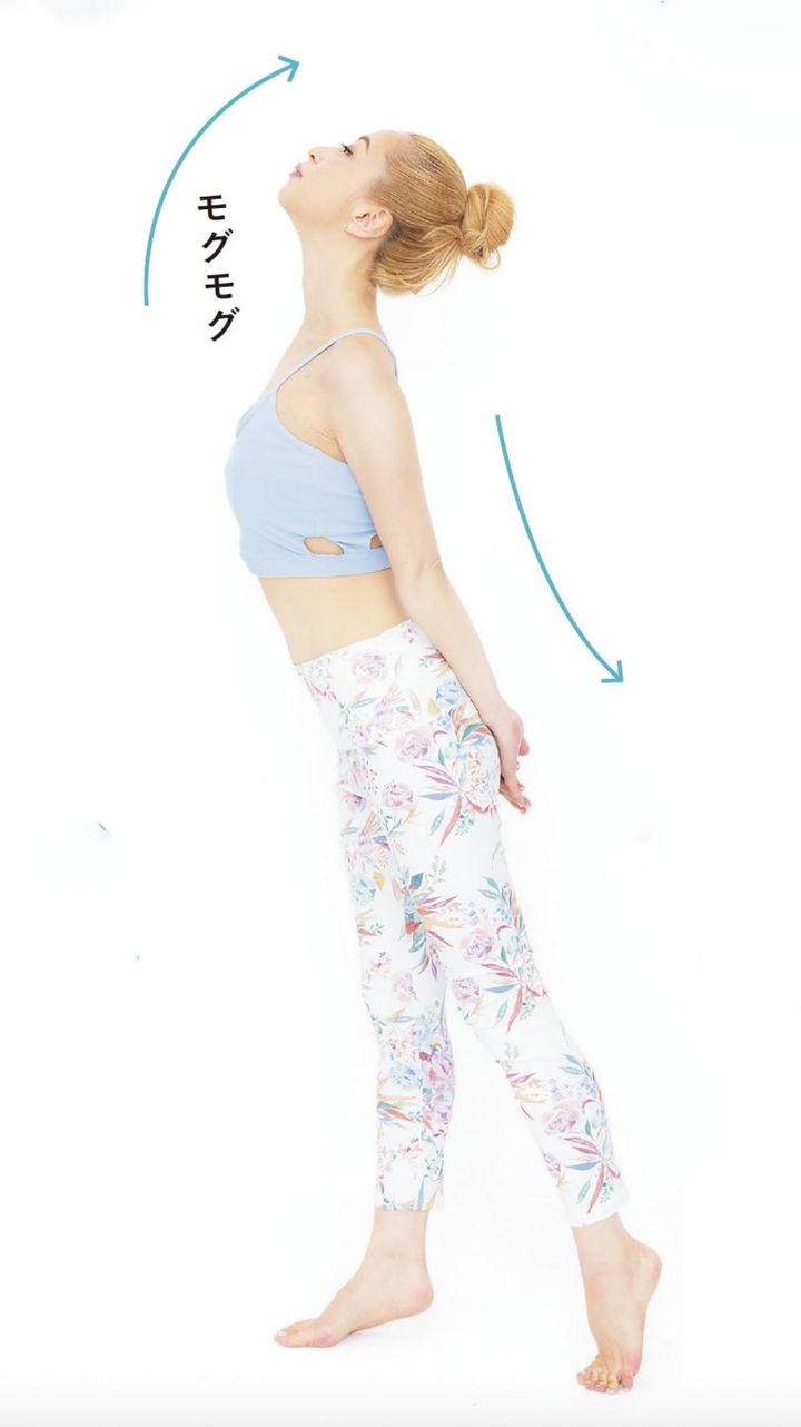 手のひらを後ろに向けておしりの上で重ね、肩甲骨を寄せて、腕を下に伸ばす。後ろに伸ばした片足と引っぱり合うように胸から首を伸ばし、口と頭を動かす。足を入れ替えて同様に。
