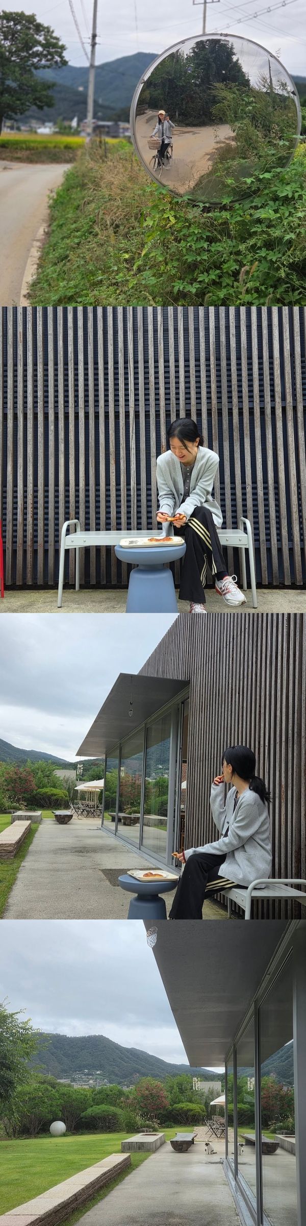 写真の中のイ・ヨンエは、自然に囲まれたカフェのような場所でパンを食べながら、まったりと風景を眺めている。ラフな服装で穏やかなひと時を過ごす彼女の姿が、見る人をもリラックスさせる。