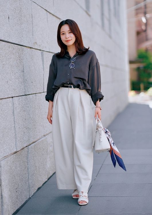 「深みのあるブラウンが上品なシャツは、シルクが入った生地なのにウォッシャブル仕様。おうちで洗濯できる手軽さが嬉しい!仕事中にかけている度入りのメガネを休みの日はアクセサリーとして投入。メガネやスカーフなど小物でもおしゃれを楽しんでいます」(IT企業勤務/池下愛美さん・24歳)