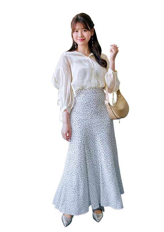 「ほんのり光沢のあるシースルーのシャツは、袖にリボンがついていて甘さを少し出せるデザインが可愛い!シャツが抜け感のある素材なので、他のアイテムで肌見せしすぎないように、ロングスカートやつま先の隠れるパンプスを合わせるのがポイントです♪」(企業受付/髙橋沙也加さん・29歳)