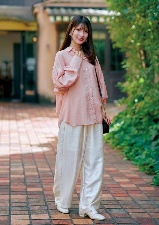 「甘めになりがちなピンクカラーも、くすみトーンで大人っぽく&落ち感のあるパンツ合わせでほどよく引き締めました。全体的にボリュームがあるので、ボトムとパンプスはホワイトで色みを統一し、ミニバッグを合わせてコンパクトにしました」(会社人事/木村咲彩さん・29歳)