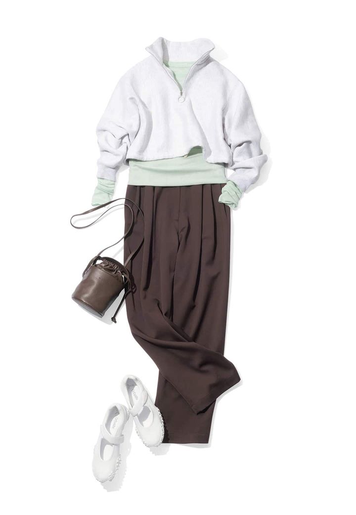 プルオーバー¥33,000(フィーニー)Tシャツ¥39,600(エイトン青山)パンツ¥49,500(アロー)バッグ¥44,000(ザハイライツ)スニーカー¥15,400(プーマ/プーマ お客様サービス)ピアス¥28,600(プラウ)