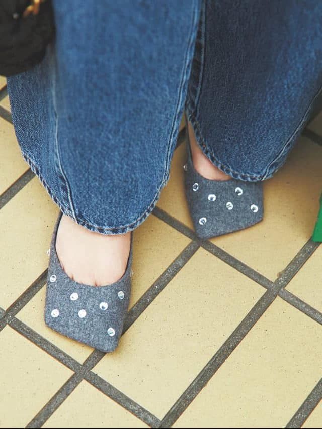 絶妙なバランスが着映えしそうな“スクエアパンプス”。落ち着いたグレーカラー×スクエアシルエットでクールに見せつつ、散りばめられたキラキラと光るビジューがアクセントに。シンプルすぎない程良いバランスがどのようなコーデにも合わせやすい。