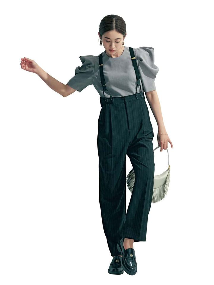 サスペンダー付きパンツ¥29,700(カレンソロジー/カレンソロジー 二子玉川)ブラウス¥25,000(シーニュ)バッグ¥143,000(J&M デヴィッドソン/J&M デヴィッドソン カスタマーセンター)ローファー¥19,800(ダイアナ/ダイアナ 銀座本店)ピアス¥3,960(プチタミ/ロードス)ブレスレット¥99,000(ウノアエレ)