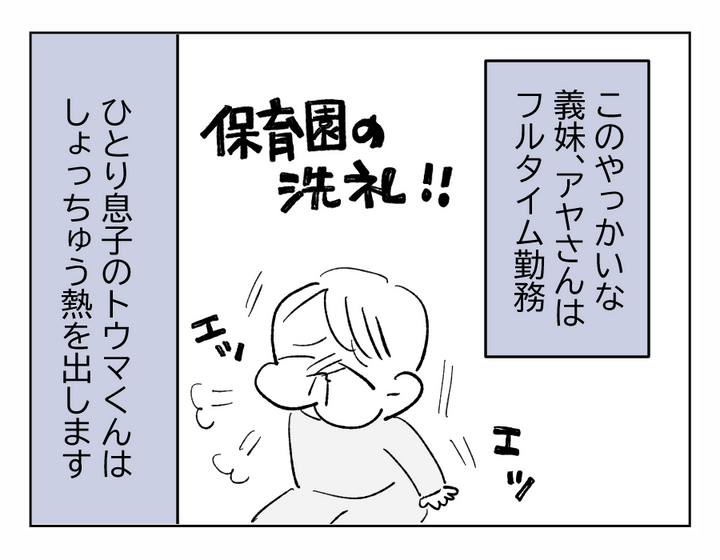 義実家の敷地は広く、チサトさん一家の家を建ててもなお、スペースが余っているそうです。なのでお義父さんは、義弟夫婦にも「うちの敷地に家を建てないか」と誘っているそうですが、義弟のお嫁さんであるアヤさんはいい顔をしていないのだとか。そんなアヤさんの息子であるトウマくんは、お熱で保育園をお休みすることが結構あるそう。パパかママがお休みを取ったり、病児保育施設にお願いしたりといろいろ対応策はありますが、いずれにしても「わが子の発熱」は大変ですよね。