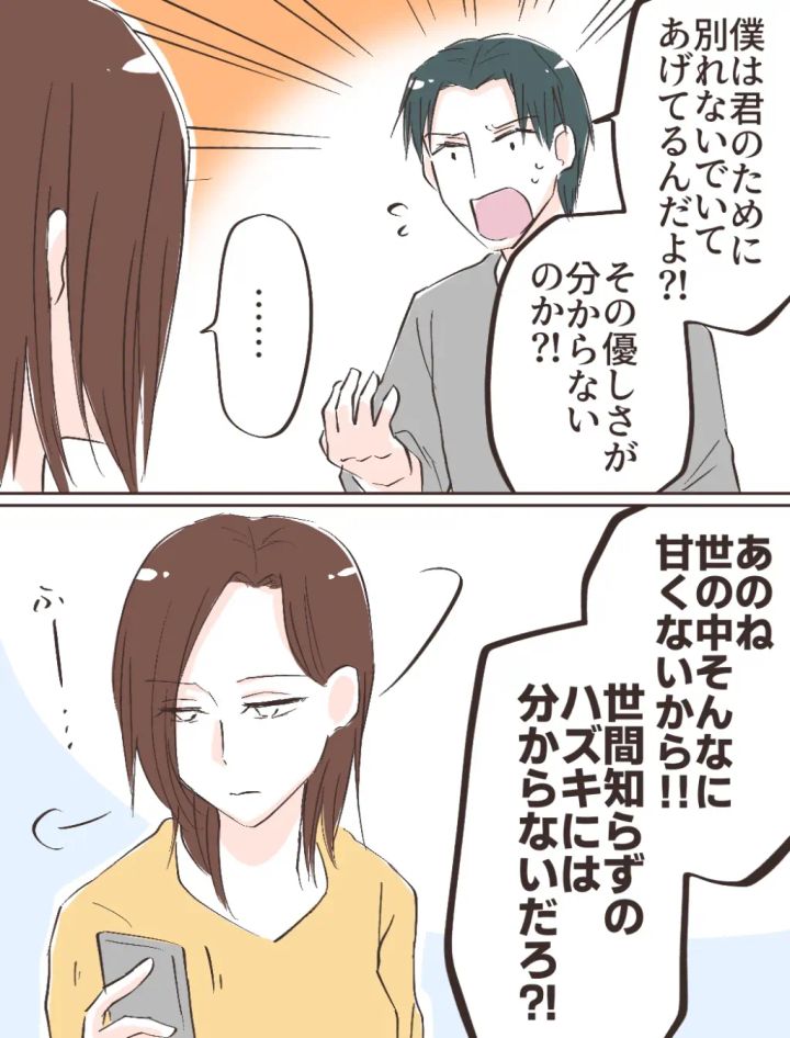 リヒトさんは「は?別れる・・?別れるって言ったの?今」と顔を歪ませました。「そうだよ。だって、リヒトさんが離婚って言ったじゃない」と返すと、「い・・今のハズキじゃ社会に出ても何の役にも立たないのにどうやって暮らしていくつもり?」と言いました。