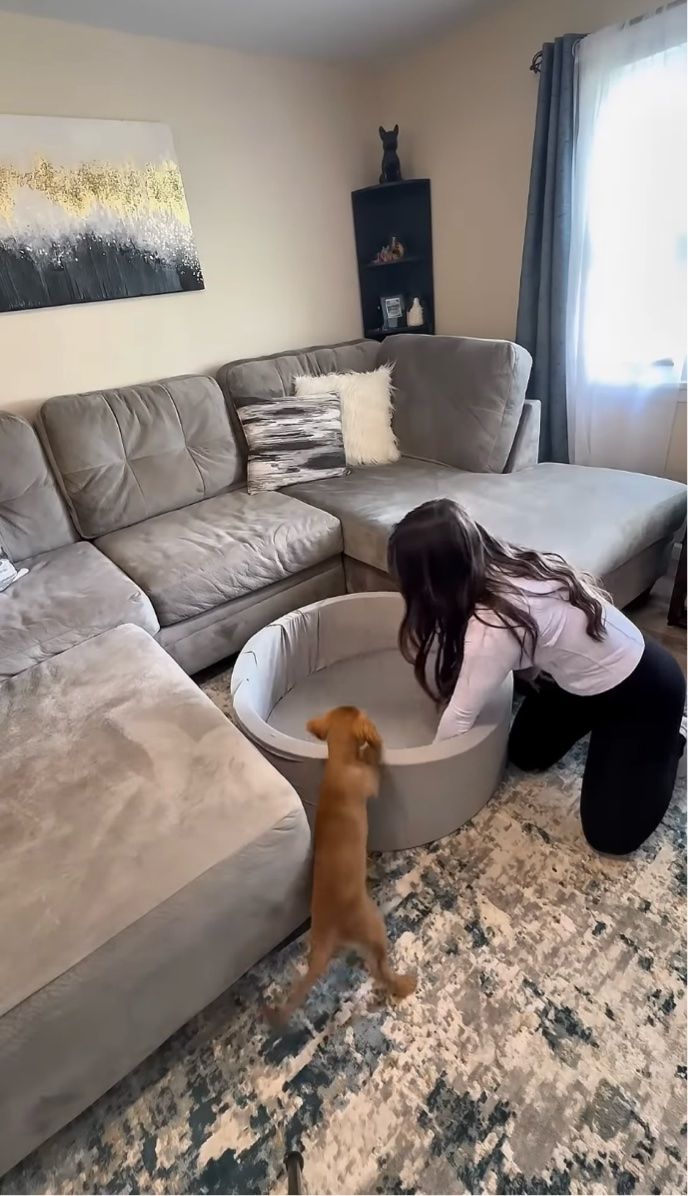ソファの前にクッション製のプールのようなものを運び込む飼い主さん。 その様子を、愛犬であるミニ・ゴールデンレトリバーの子犬『セージ』が興味深そうに見つめています。