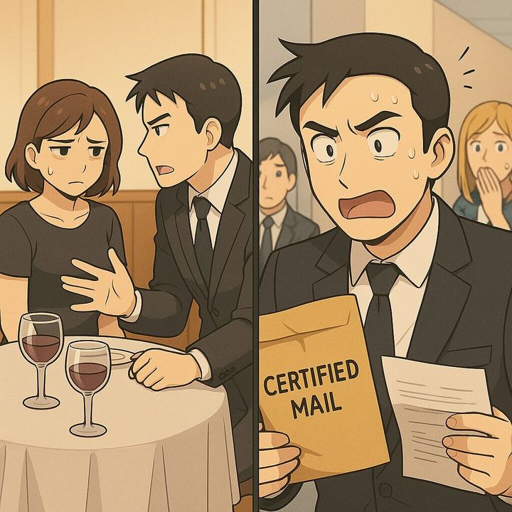 数日後、彼の会社の記念すべき設立パーティーの会場に、弁護士を通して内容証明郵便が届けられました。もちろん、中身は私のアイデアの盗用を指摘し、事業の即時停止を求める警告書です。