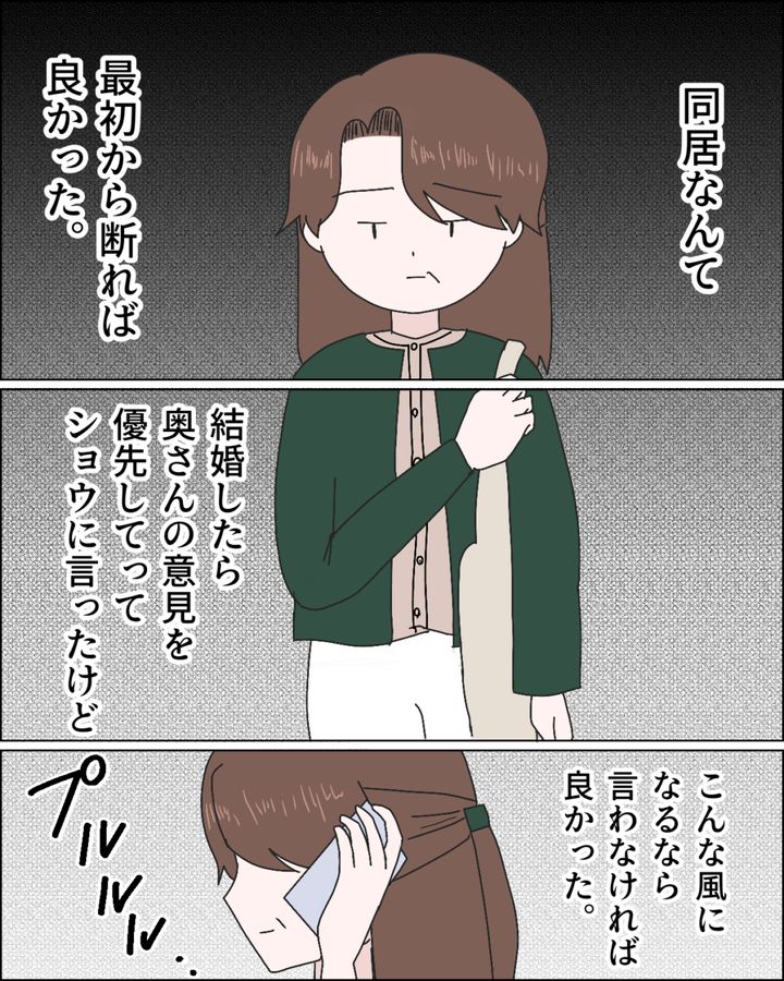 同居なんて最初から断れば良かった。結婚したら奥さんの意見を優先してってショウに言ったけど、こんな風になるならあんなこと言わなければ良かった。家を出た私は、そんなことを考えながらある人に電話をかけました。