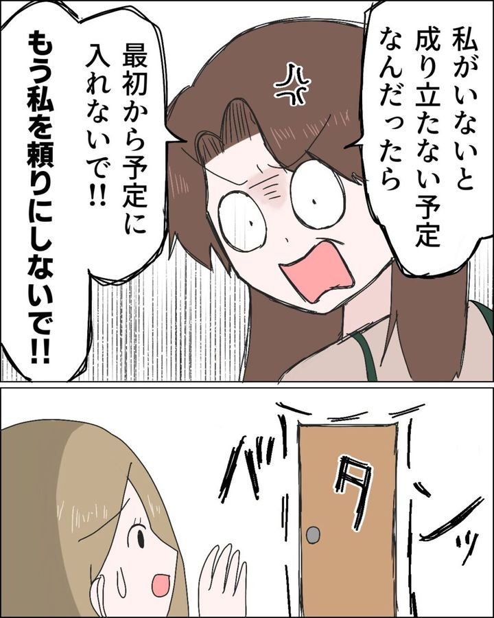 これだけ言ってもまだ自分優先なアミちゃんの身勝手さに私の怒りは頂点に。「私がいないと成り立たない予定なんだったら最初から予定に入れないで!!もう私を頼りにしないで!!」私はそう言い捨てると、玄関を出てバタンッと勢いよくドアを閉めました。