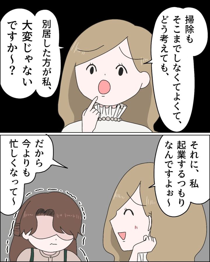 「掃除もそこまでしなくてよくて、どう考えても、別居した方が私、大変じゃないですか~?」と同居でいかに自分が楽をできているか堂々と話すアミちゃん。さらに「それに、私、起業するつもりなんですよぉ~。だから今よりも忙しくなって~」と嬉しそうにペラペラ。自分がやりたいことをやるために家事育児は私にやってもらいたいとあっけらかんと話すアミちゃんに沸々と怒りが湧いてきました。
