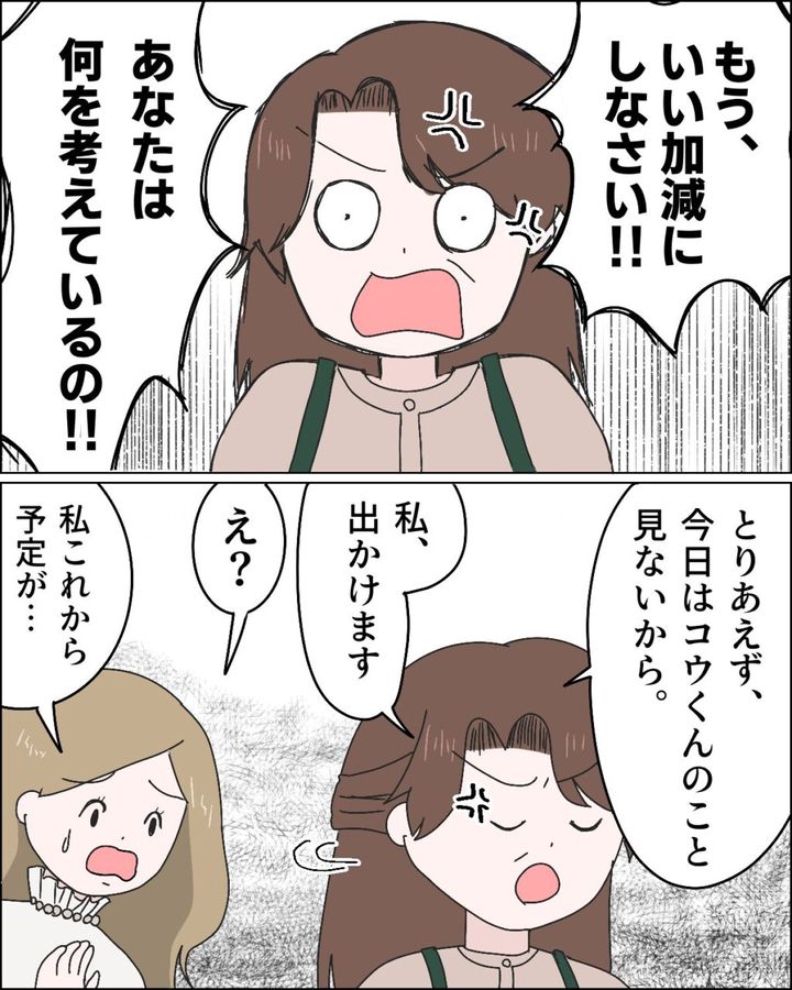 もう我慢の限界です。「もう、いい加減にしなさい!!あなたは何を考えているの!!」ついに私は切れました。「とりあえず、今日はコウくんのこと見ないから。私出かけます」と言って立ち去ろうとすると、「え?私これから予定が・・」とアミちゃんが慌てて言いました。