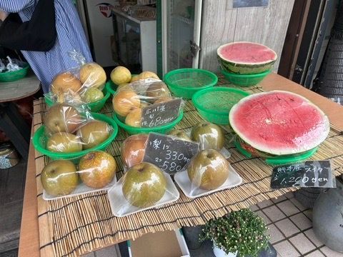 久留米の鳥飼小学校の近くを車で進んでいたら、八百屋さん前のベンチに笑顔の女性たちが座っている姿を発見。 お顔を見たら全員なぜかとっても幸せそう。そして手には大きな果物が乗った何かを持っています。 「あれは何だろう?行って確かめたい!」と帰りに寄ってみました。