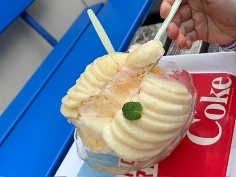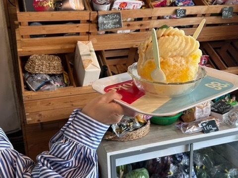 奥で作って出してきてくれたかき氷を見てびっくり! 「大きい〜!」二人で歓声を上げてしまいました。 桃が丸ごと一個入っているだけあって大ぶりの果肉がこれでもかとトッピングされています。