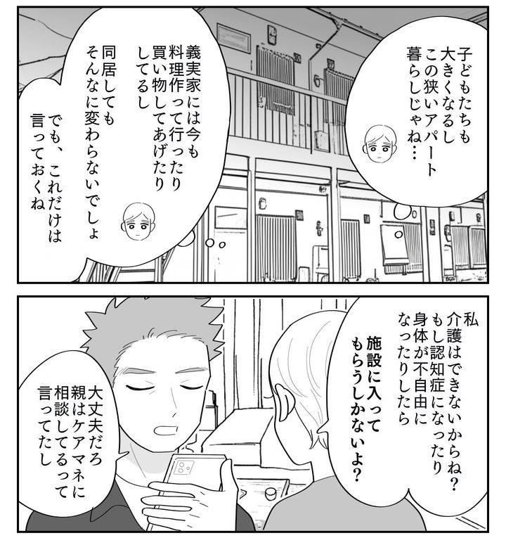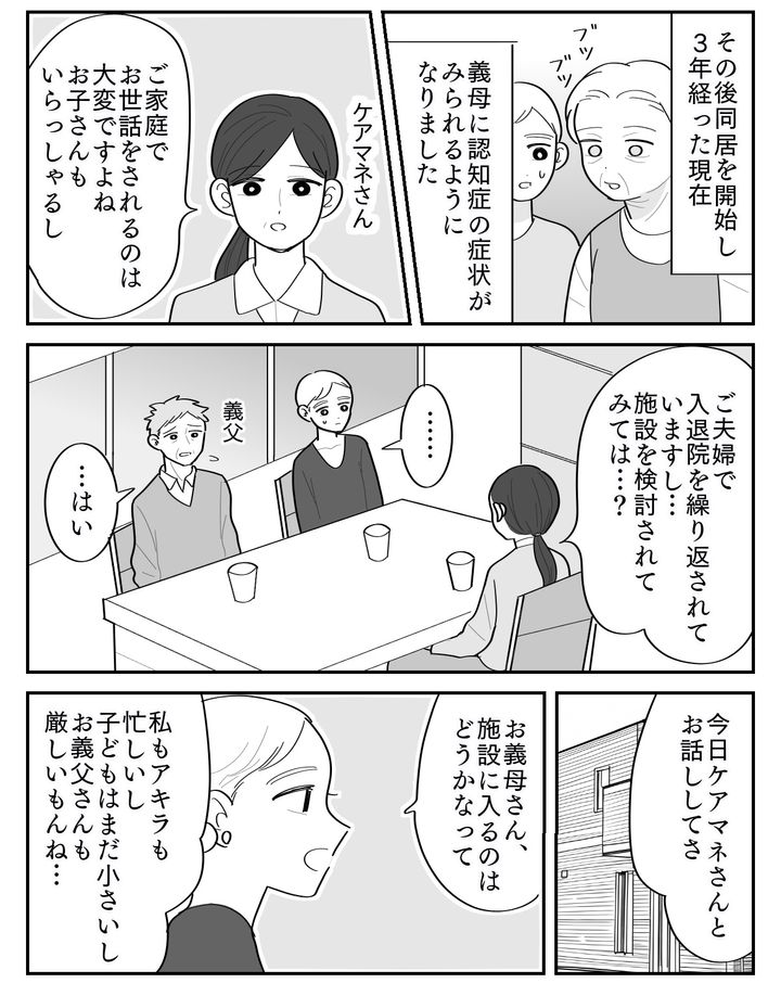 義父に頼まれ、半休を取ってケアマネジャーさんとの話し合いに同行した私。私は仕事に子育てにと毎日大忙しだし、義父も体調の問題を抱えています。そのため義母には施設に入ってもらおうという話になりました。しかし夫は……。