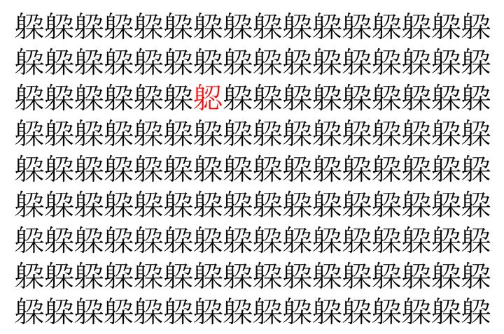 画像の中には、「躱」という漢字が縦に9行、横に16個並んでいます。 全部で144個となりますが・・・、そのうち1つは「異なる漢字」となってますよ!!
