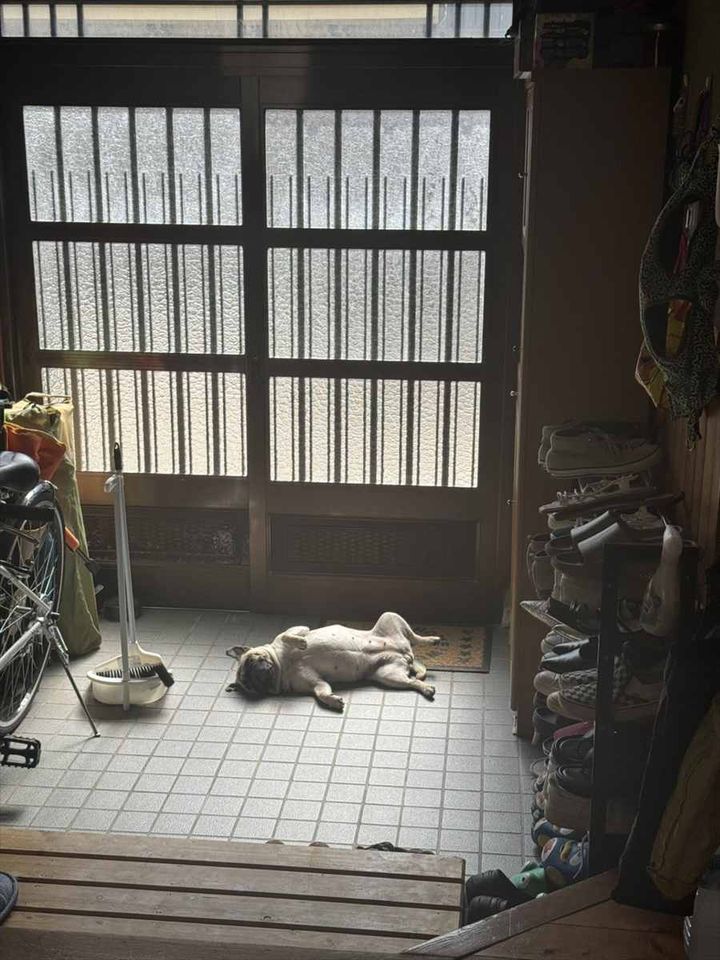 玄関で寝ていたパグ。 その自由奔放な寝姿が話題になっています!