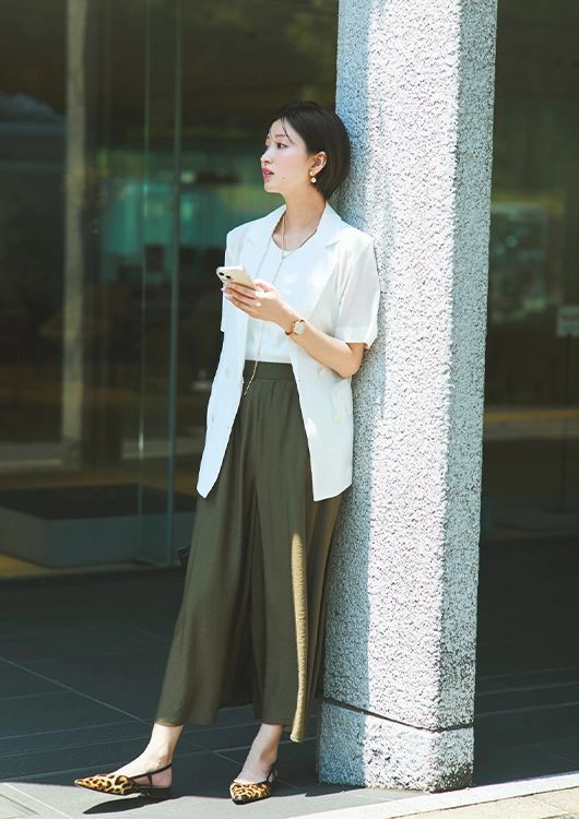 ほんのりシアーな素材で涼しげなムードをまといつつ、ダブルプレストできちんと感も演出できる半袖ジャケット。カーキパンツやレオパード柄パンプスを合わせて辛口にまとめると、軽やかな装いでも秋らしいトーンにスイッチできる。