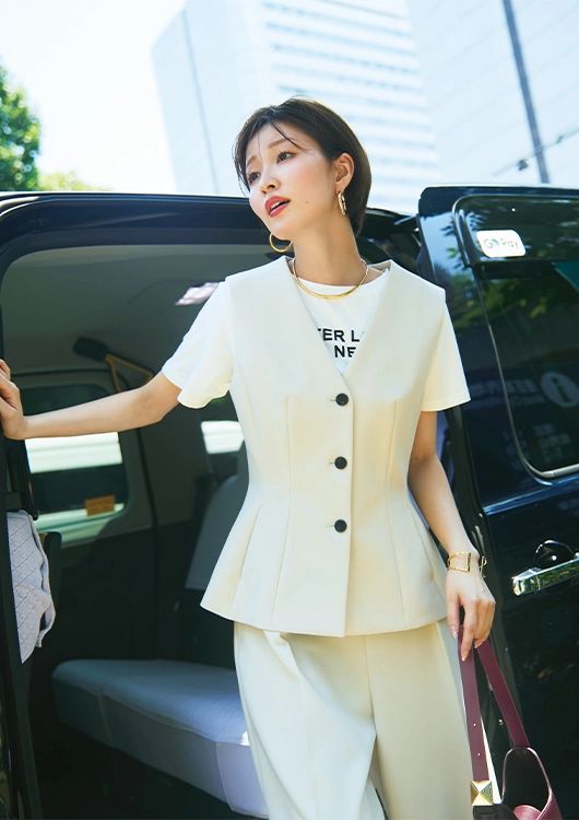 ウエストのラインを美しく見せる計算ずくなシルエットのジレは、撥水加工&洗濯機で洗えるという残暑にうれしい機能もあり。さらに、シャープなVラインの首元から中のTシャツのロゴがちら見えする着こなしがおしゃれ度をアップ。ジレと同素材のワイドパンツを合わせて、ハンサムな着こなしにすることできちんとした印象を底上げして。