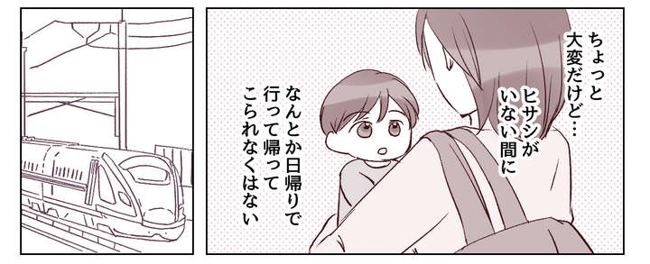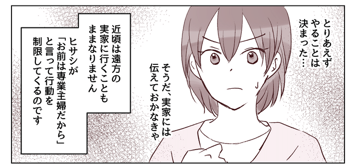 ヒサシは「お前は専業主婦だから」と言って私の行動を制限しています。実家の両親に会いに行くため、私はヒサシが仕事で遅くなる日を狙いました。ヒサシが朝出かけたのを確認するとタケルを連れて新幹線に乗り、実家に向かいます。