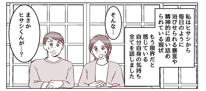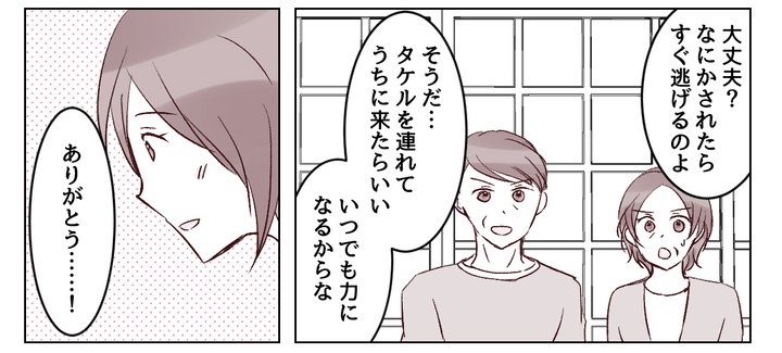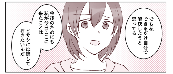 両親は味方になってくれました。私を守ろうとしてくれる温かい言葉に涙が出ます。私は決してひとりじゃない……! ただ自分の人生を自分で歩むためには、守られているだけじゃダメ。ヒサシとの問題はできるだけ私自身の力で解決するつもりです。