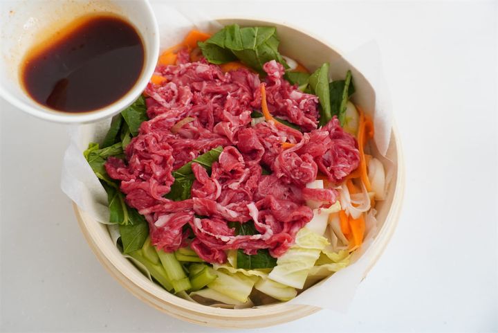 2. クッキングシートをせいろの大きさに合わせてふちまで敷き、1の野菜の上に牛肉をのせ、[A]を回しかける。
