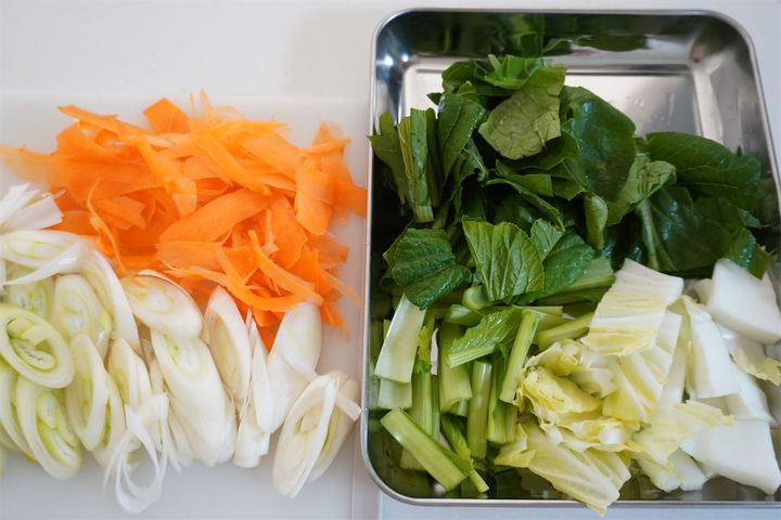 1. 長ねぎは斜め切り、にんじんはピーラーでスライス、小松菜と白菜はひと口大に切る。[A]の調味料は混ぜておく。