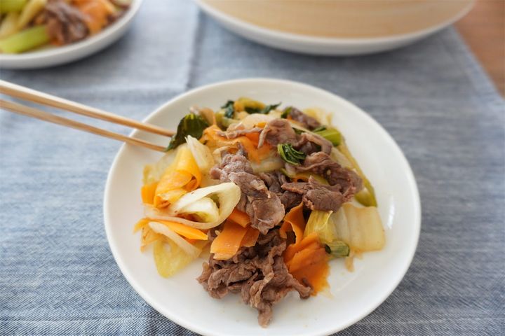 伝統的な韓国料理のひとつである"チャプチェ"は、漢字で「雑菜」と書き、何種類もの野菜、きのこ、牛肉などを細切りにして炒め、韓国式の春雨と混ぜ合わせて作る料理のこと。今回のレシピでは春雨を使いませんが、野菜とお肉の下に春雨を敷いて蒸せば、よりチャプチェに近い一皿になるそうです。