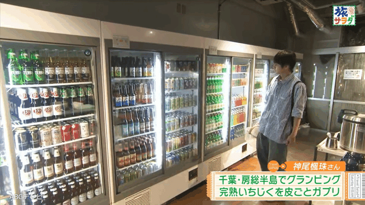 元保健室は、種類豊富な酒がズラリと並ぶマーケット! 100種類を超えるアルコール飲料とソフトドリンクがなんと飲み放題で、ボトルサラダやおつまみまで揃っている。千葉のクラフトビールもたくさんあり、神尾は九十九里のピルスナーとサラダを持って、夕食会場のBBQサイトへ向かった。