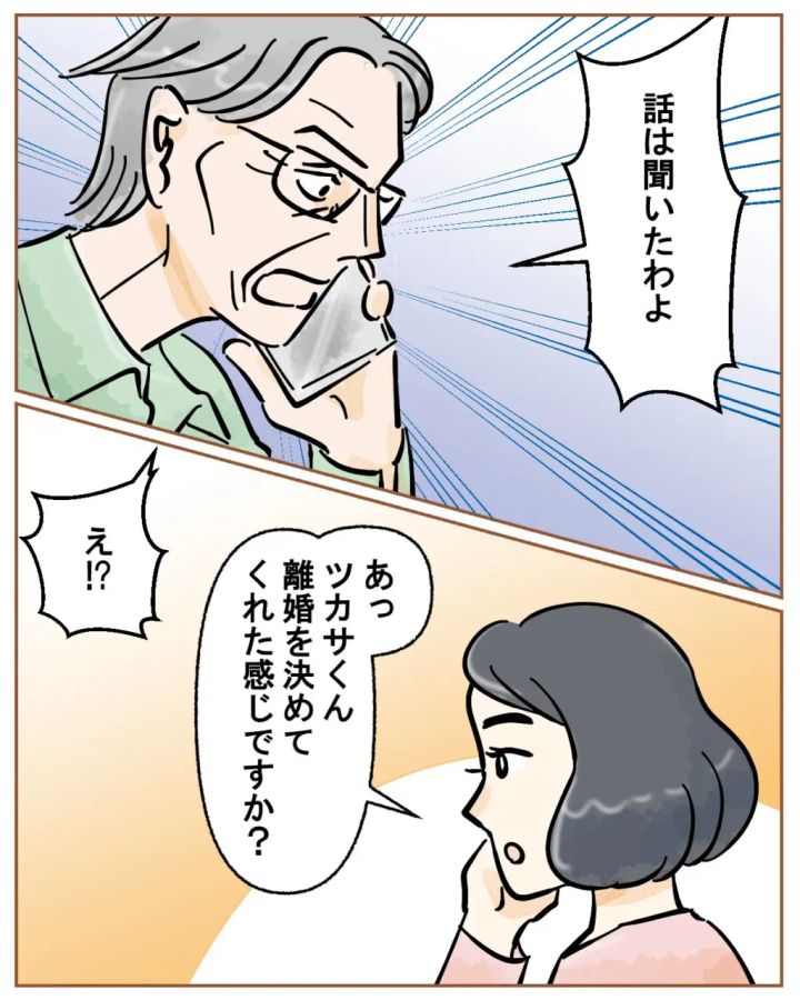 ツカサさんを独り残し、家を出たナズナさんに電話がかかってきました。電話の相手は義母。ナズナさんは、「話は聞いたわよ」と言う義母に「ツカサくん、離婚を決めてくれた感じですか」とたずねると、「え!?」と心底驚いたように言いました。息子が嫁に別れを切り出されたと知り、電話をかけて「忍耐がない」だなんて・・呆れて何も言えなくなってしまいますよね。