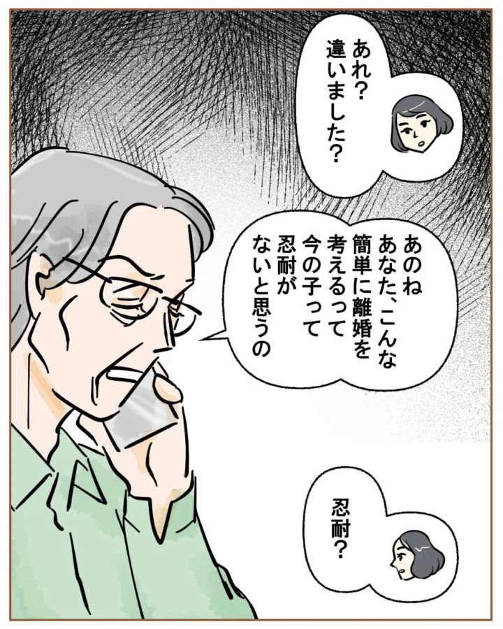 「あれ?違いました?」と聞き返すと、「あのね、あなた、こんな簡単に離婚を考えるって、今の子って忍耐がないと思うの」その言葉に「忍耐?」とまた聞き返すと、