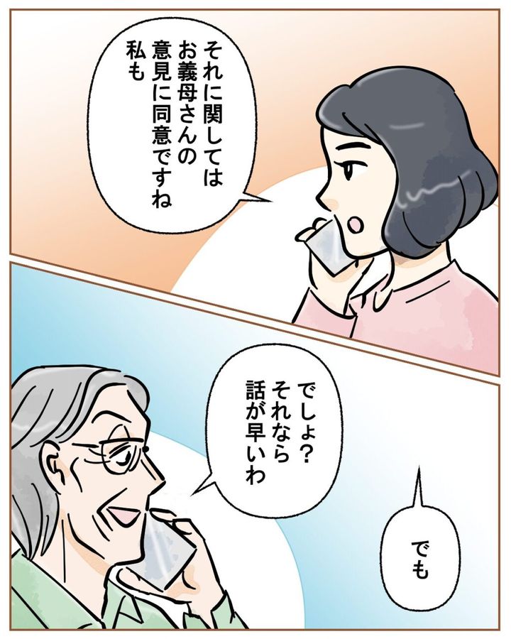 「それに関してはお義母さんの意見に同意ですね、私も」と答えると、「でしょ?それなら話が早いわ」と言う義母に、「でも、」と切り出しました。