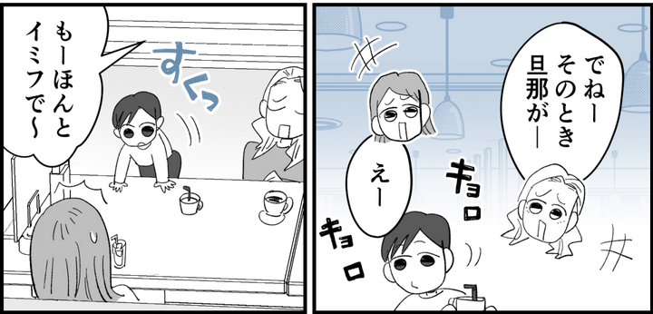 待ち合わせたのはちょっとお高めのファミレス。私は久しぶりに会うミスズとの会話を楽しむため、子どもたちは夫に預けました。ミスズの子、ユイトくんは私の次女と同い年の3歳! 会ったのはユイトくんがまだ新生児のころ……出産祝いでミスズの家にお邪魔したとき以来です。