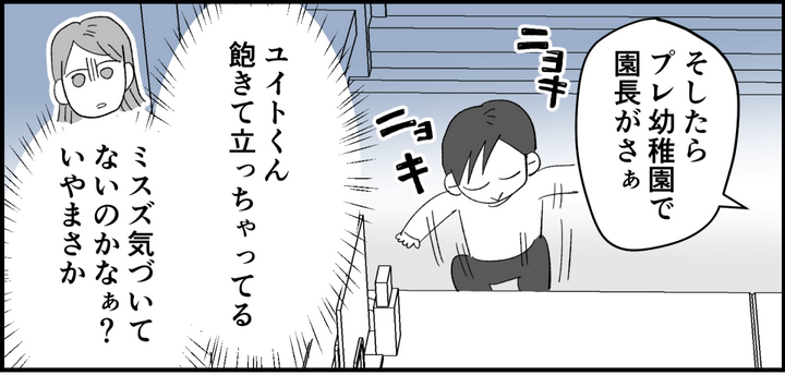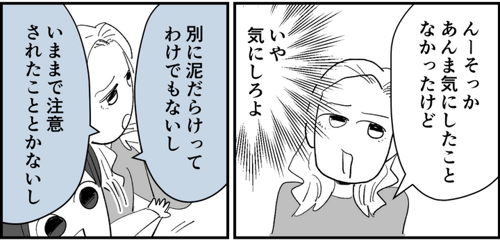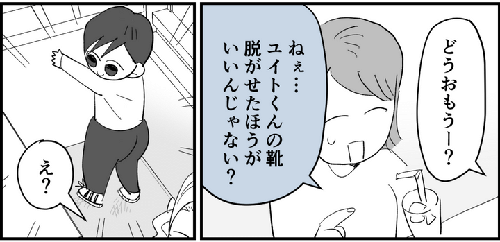 ミスズは楽しそうに話をしていますが、私はユイトくんが靴のままソファにのっていることが気になって仕方なく、ミスズの話もまったく頭に入ってきません。もし自分の子どもがしていたら……私はソファにのった瞬間に注意していることでしょう。靴を履いていない状態なのであればまだ理解もできますが……靴のままは完全NGだと思います。