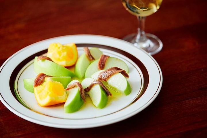 りんごを切る。アンチョビをのせる。オレンジ果汁とオリーブオイルをかける。以上!