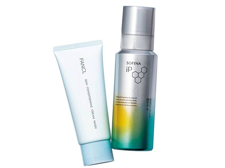 (左)スキンコンディショニング洗顔 90ℊ ¥1,595/ファンケル (右)ソフィーナ iP 水光ピーリング泡セラム 120g ¥4,290(編集部調べ)/花王