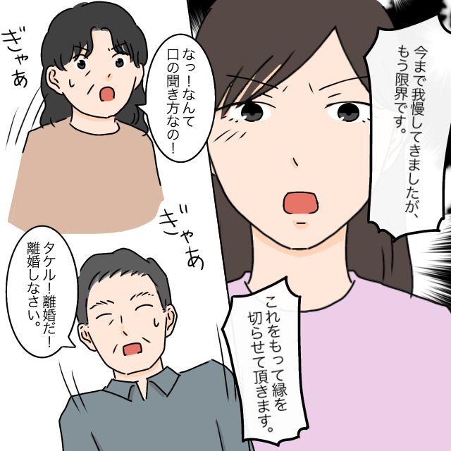 「今まで我慢してきましたがもう限界です、これをもって縁を切らせて頂きます」と言うと、「なんて口の聞き方だ!」「タケル、こんな人とは離婚しなさい!」と義両親は大騒ぎ。自分達の家に嫁いだ嫁が夫だけでなく、その両親に物申すなんてありえないと言わんばかりに騒ぎ立てます。