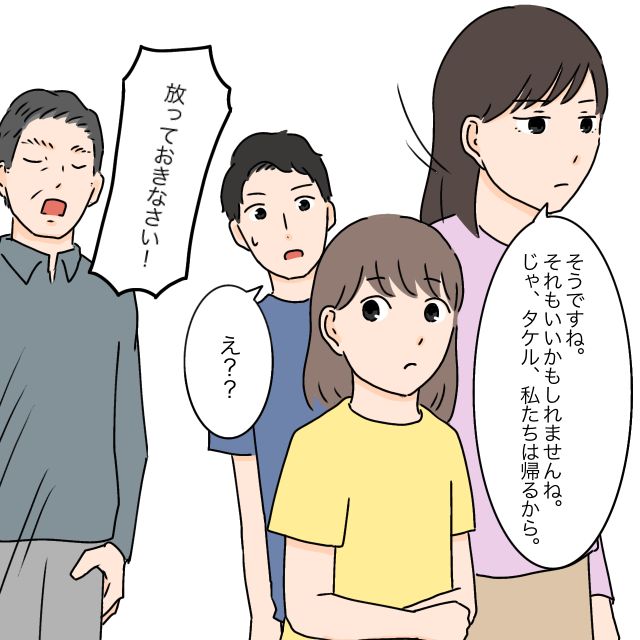 タケルさんの言う事を聞かないモエさんとマヒロちゃんが気に食わないのか、義両親は「マヒロちゃん、もしよかったらタケルとこっちに帰ってきてもいいのよ」「早めに帰って来ないとモエさんみたいな常識知らずになるぞ」と馬鹿にします。モエさんはタケルさんを見ますが、2人をかばう様子はありません。すると、マヒロちゃんの口から「もう帰りたい」という言葉がこぼれました。それを見て我慢の限界に達したモエさんは、ついに「今まで我慢してきましたがもう限界です、これをもって縁を切らせて頂きます」と言いました。自分達の家に嫁いだ嫁が夫だけでなく、その両親に物申すなんてありえないと思った義両親は、「タケル、こんな人とは離婚しなさい!」と大騒ぎ。その様子を見て、相手にするだけ無駄と感じたモエさんは、「離婚するのもいいかもしれませんね」とだけ言い、義実家を後にしました。