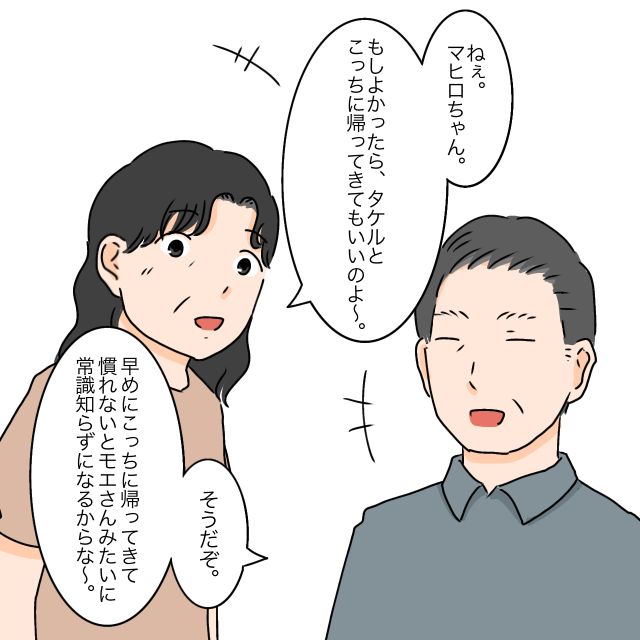 タケルの言う事を聞かない私とマヒロが気に食わないのか、義両親は「マヒロちゃん、もしよかったらタケルとこっちに帰ってきてもいいのよ」「早めにこっちに帰って来ないとモエさんみたいに常識知らずになるからな」と、馬鹿にしたように笑います。