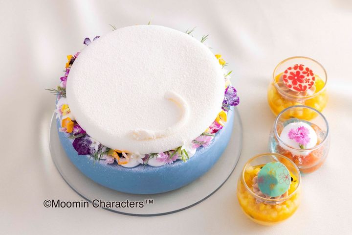 「ムーミン」の作品に登場する個性的で魅力的なキャラクターを思わせる約25種類のスイーツは、「ヒルトン大阪」のエグゼクティブ・ペストリーシェフ百田利治(ひゃくだ としはる)氏がプロデュース。「ムーミンのまんまるおしり」、「ムーミンママのエプロンケーキ」、「ニョロニョロ大発生中」をはじめ、「リトルミイのムース」、スティンキーのフォルムそのままをかたどった「いただき!スティンキー」などが並びます。