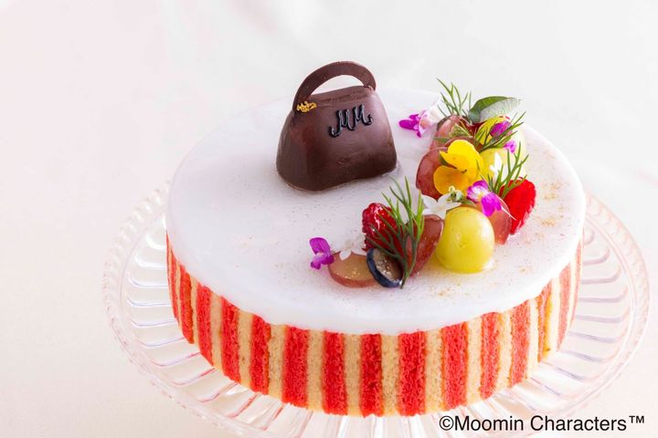 エプロンの赤と白を思わせるストライプ柄のスポンジをまとったラウンドケーキ。シナモンババロワをベースにアーモンドダコワーズ、スダチクリームの組み合わせ、香ばしさと酸味のバランスが絶品。なんでも揃っているムーミンママのバッグのように、味わいも変化に富んでいます。