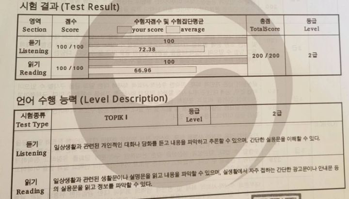 7月に受けたTOPIKの結果をパソコンで閲覧しました。