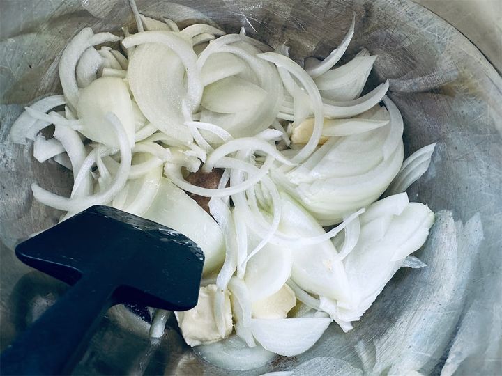 1. しいたけ、マッシュルームは石づきを除いて千切りにします。しめじは石づきを除いて、ほぐします。玉ねぎは薄切りにします。
