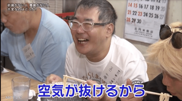 続いて「うどん早食い対決」へ。前歯がない人は「空気が抜ける」からすすることができない。歯茎で噛むため、やけどをしないように、フーフーして冷ます時間もかかっている。こちらも奥歯のないチームの圧勝に終わった。
