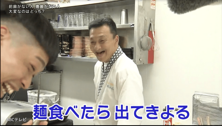 上の歯が全部ないという飲食店の男性は「麺食べたら出てきよる」とのこと。