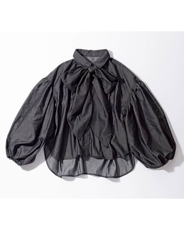ボリュームのある袖、大きめなリボンタイがカジュアルなデニム素材を大人のお出かけ仕様に昇華。胸元の切り替えでスッキリと立体的なシルエットに見せてくれます。インしてもアウトしてもバランスよく着られる丈感にしサイドにスリットを入れました。リボンなしでシンプルに少し辛口にシフトできるので幅広いテイストを楽しめます。