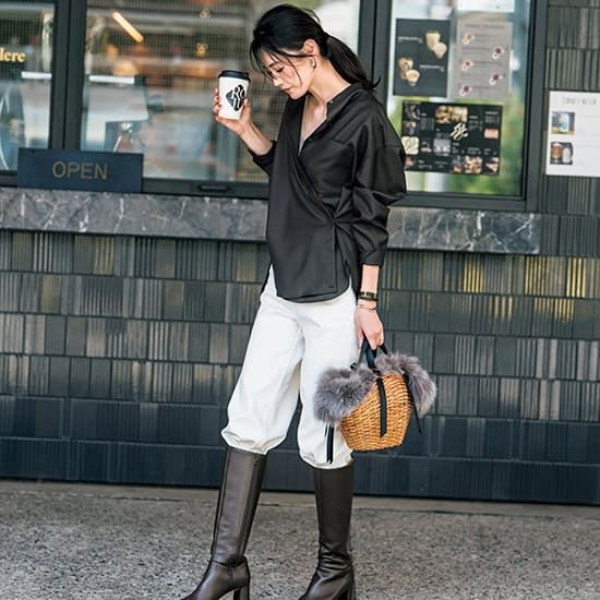 【1枚目】シャツ¥14,960スカート¥16,940(ともにDay by Day It’s international) バッグ ¥27,500(ヴィオラドーロ)パンプス¥17,600(ダイアナ/ダイアナ 銀座本店)時計¥20,900(マトウ/エイチエムエスウォッチストア表参道)ネックレス¥46,200(ミチウィルウェイ)ブレスレット¥6,330〈エイチアッシュ〉ピアス¥115,500〈モニス〉(すべてフォーティーンショールーム)【2枚目】シャツ¥14,960スカート¥16,940(ともにDay by Day It’s international)バッグ ¥31,900(ヴィオラドーロ)パンプス¥17,600(ダイアナ/ダイアナ 銀座本店)ピアス¥6,820(イットアトリエ/フォーティーン ショールーム)【3枚目】シャツ¥14,960(Day by Day It’s international)パンツ27,500(ヤヌーク/カイタックインターナショナル)バッグ¥30,800(ヴィオラドーロ)ロングブーツ¥42,900(ダイアナ/ダイアナ銀座本店)バングル¥66.000ピアス ¥68,400(ともにミチ ウィルウェイ/フォーティーンショールーム)レザーブレスレット(スタイリスト私物)