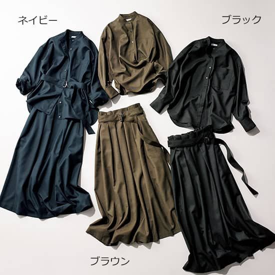 秋本番の装いを楽しみたい10月、そんな気分に寄り添う程よい流行感と女性らしさを兼ね備えたシックなシャツとスカートのセットアップ(単品購入可能)。適度にハリと光沢を持つしなやかな風合いのバックロングシャツは、ウエストアウトしてベルトをONする着こなしもオススメ。さらには、ボタンを留める位置でニュアンスが変えられるデザインだから、着回し力大です。スカートは腰回りはスッキリと見えるハイウエストデザインで後ろはゴム仕様なので、着心地の良さとスタイルUPを両得できます。