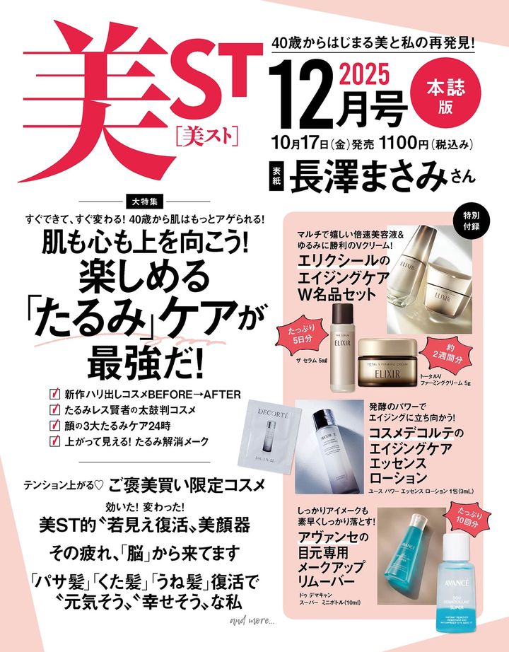 10月17日(金)発売・美ST12月号のネット書店予約がスタートしました!本誌は長澤まさみさん、増刊は西山智樹さん・前田大輔さんが初表紙を飾ります。本誌・増刊共通付録はエリクシールのエイジングケアW名品セット。さらに本誌にはコスメデコルテのエイジングケアエッセンスローションとアヴァンセの目元専用メークアップリムーバーのたっぷりボトルが付録に。増刊には、アルブランの新・潤白美肌!体感セットとアクアレーベルの新フェイスマスクが付録につきます。!ネット書店が完売の際はお近くの書店でのご予約がおすすめです。