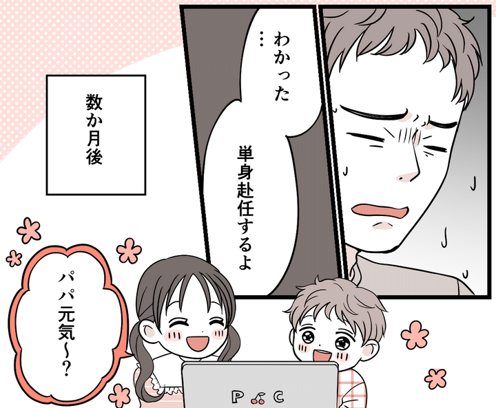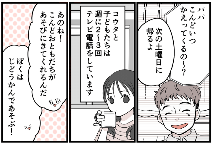 それから数か月後、コウタは単身赴任で転勤先へ。私と子どもたちは、今まで暮らしていた家で以前と変わらない生活を送っています。コウタと子どもたちは週に2~3回はテレビ電話をしています。